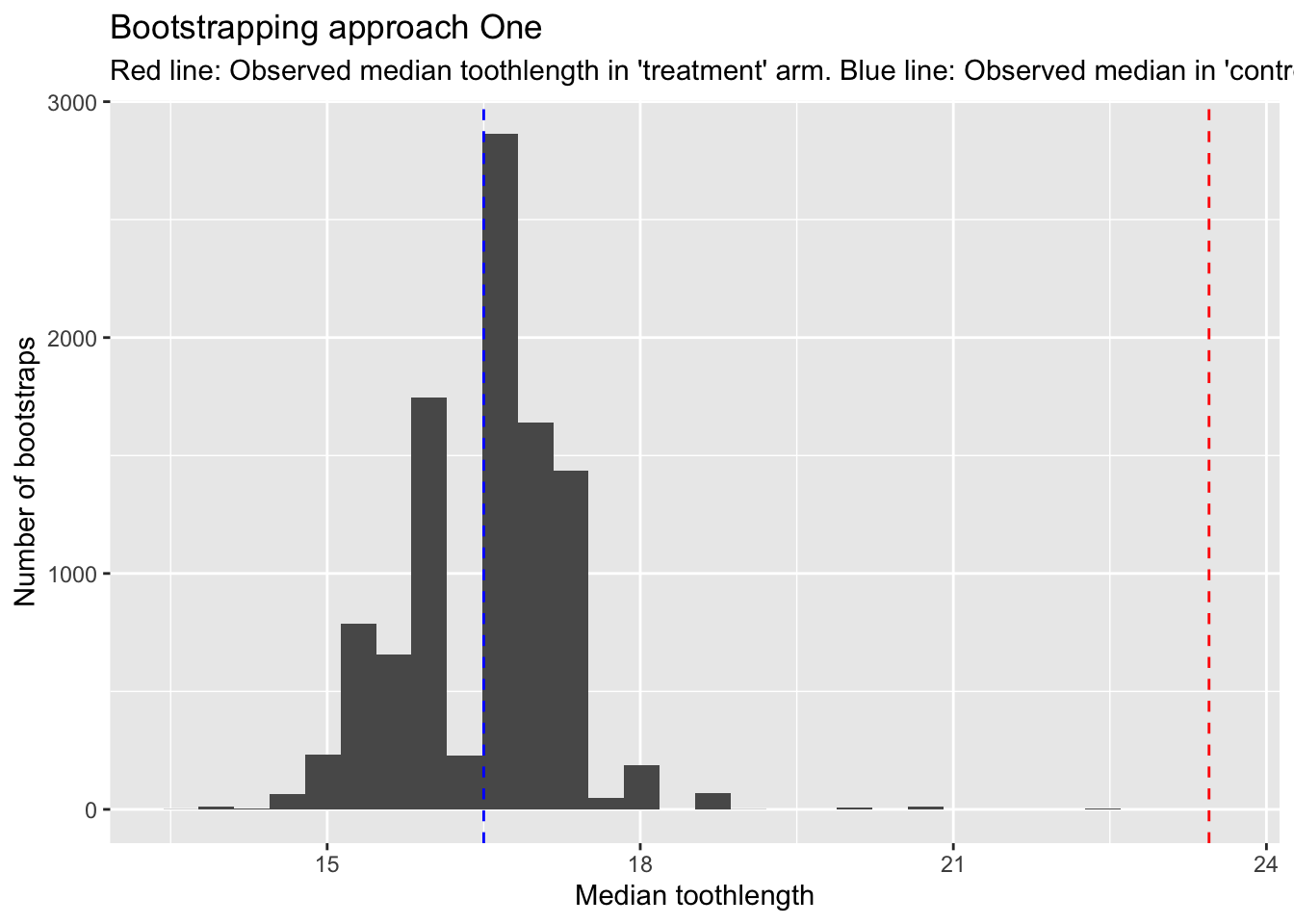 treatment_toothlengths <- df |>filter(supp =="OJ", dose ==1.0) |>pull(len) # pulling teeth for the 'treatment' populationobs_med_oj <-median(treatment_toothlengths)tibble(bs_control_median = bs_med_vc) |>ggplot(aes(x=bs_control_median)) +geom_histogram() +geom_vline(xintercept = obs_med_oj, colour ="red", linetype ="dashed") +geom_vline(xintercept =median(control_toothlengths), colour ="blue", linetype ="dashed") +labs(x ="Median toothlength",y ="Number of bootstraps",title ="Bootstrapping approach One",subtitle ="Red line: Observed median toothlength in 'treatment' arm. Blue line: Observed median in 'control' arm" )