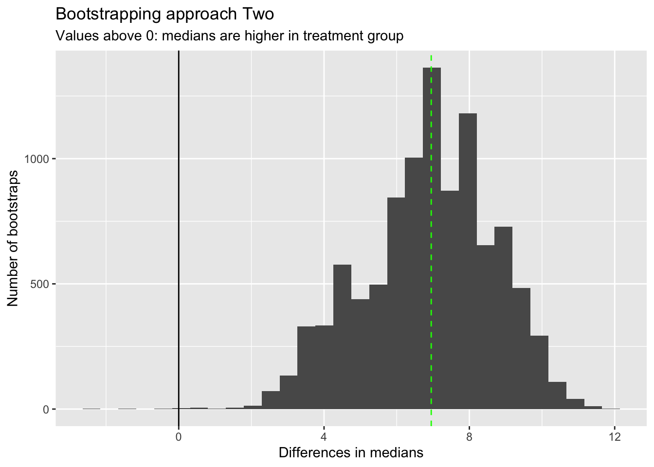 I’ve added the observed difference in medians as a vertical green line. This corresponds with the highest peak in bootstrapped differences in medians, as we might expect.