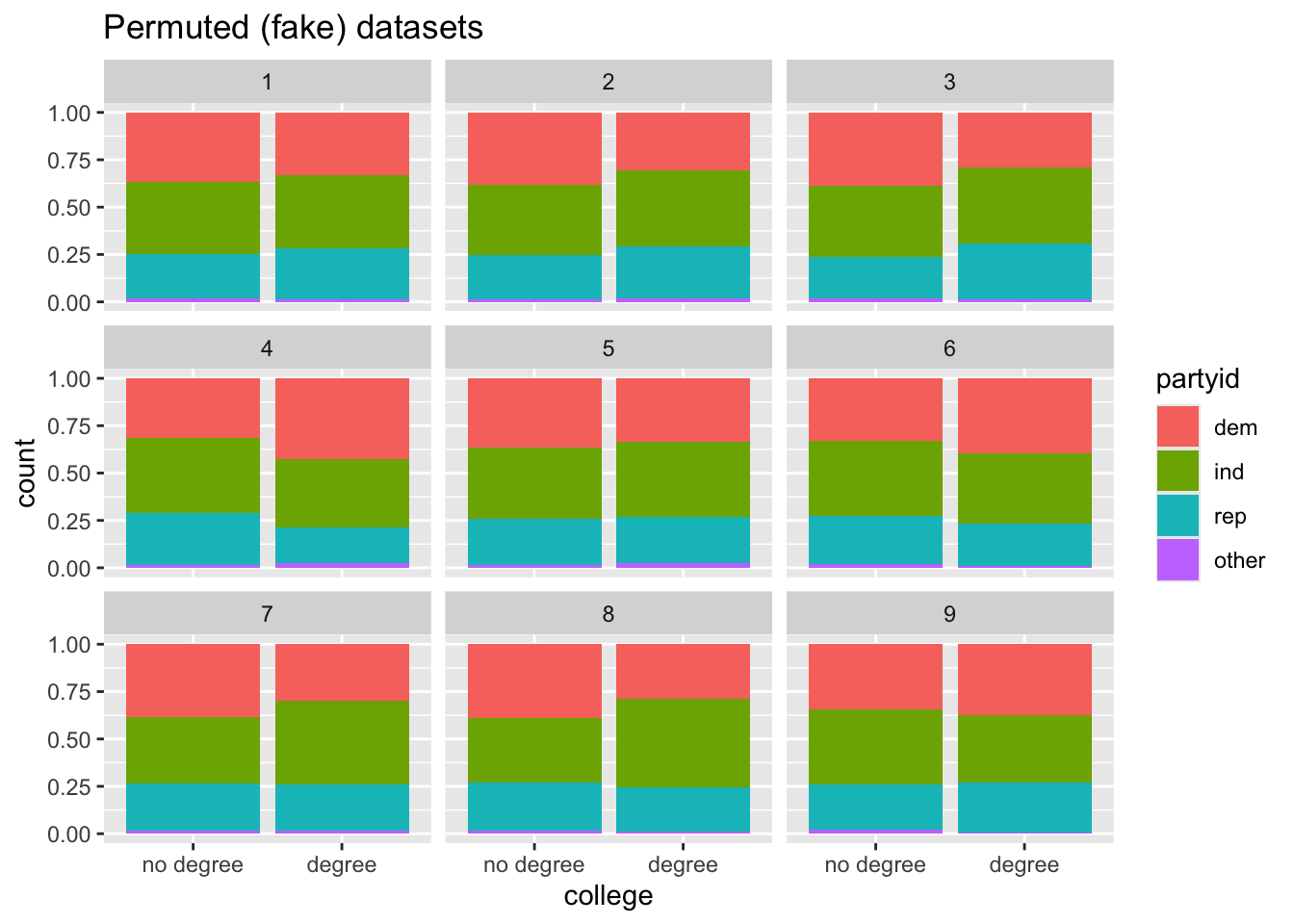 model |>filter(replicate <=9) |>ggplot(aes(x = college, fill = partyid)) +geom_bar(position ="fill") +facet_wrap(~replicate) +labs(title ="Permuted (fake) datasets")