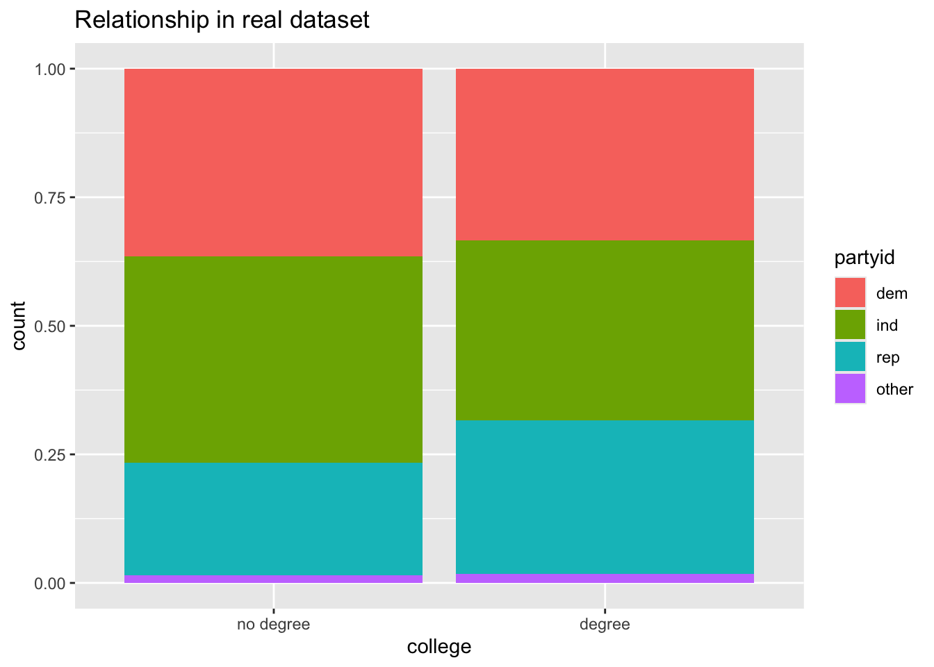 gss |>ggplot(aes(x = college, fill = partyid)) +geom_bar(position ="fill") +labs(title ="Relationship in real dataset")