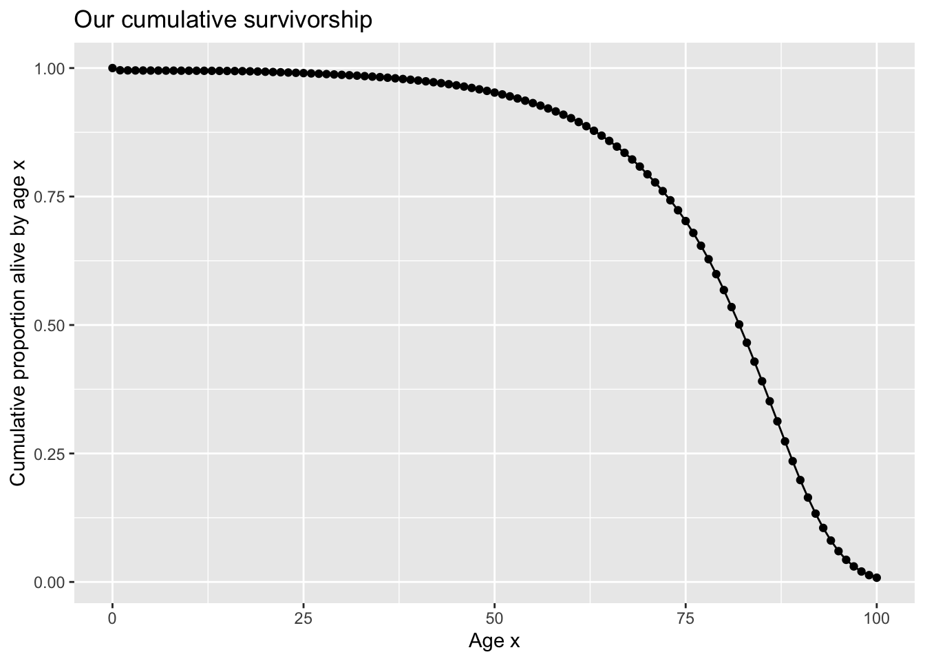 We can see that these quantities are effectively identical. Additionally, they are both a type of survival function \(S(t)\), showing cumulatitve survival probability from time 0 through to time t, so long as we assume (again, a strong assumption) that x and t are effectively the same. The lifetable \(l(t)\) is therefore an example of a nonparametric survival function \(S(t)\) that operates with discrete time intervals (as with a Markov model), even though they are often used and applied by different fields to those where survival models are the bread-and-butter, leading to different terms and symbols often being used.