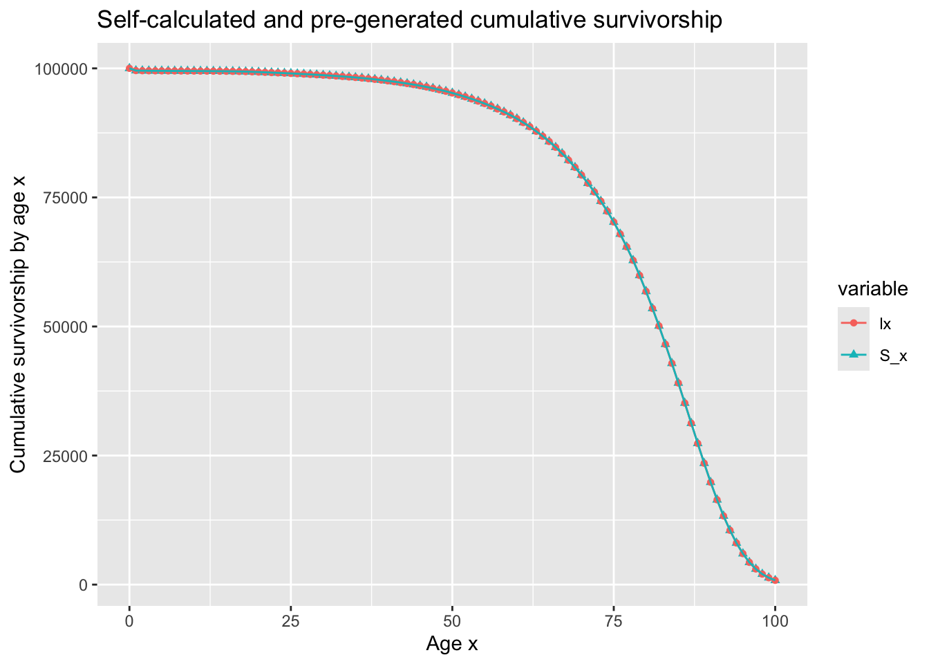 mini_lifetable %>%left_join( lifetable_male_latest %>%select(x = age, lx) ) %>%mutate(S_x =100000* S_x) %>%select(x, S_x, lx) %>%pivot_longer(cols =c(S_x, lx), names_to ='variable',) %>%ggplot(aes(x=x, y = value, colour = variable, group = variable)) +geom_point(aes(shape = variable)) +geom_line() +labs(title ='Self-calculated and pre-generated cumulative survivorship', x ='Age x', y ='Cumulative survivorship by age x' )