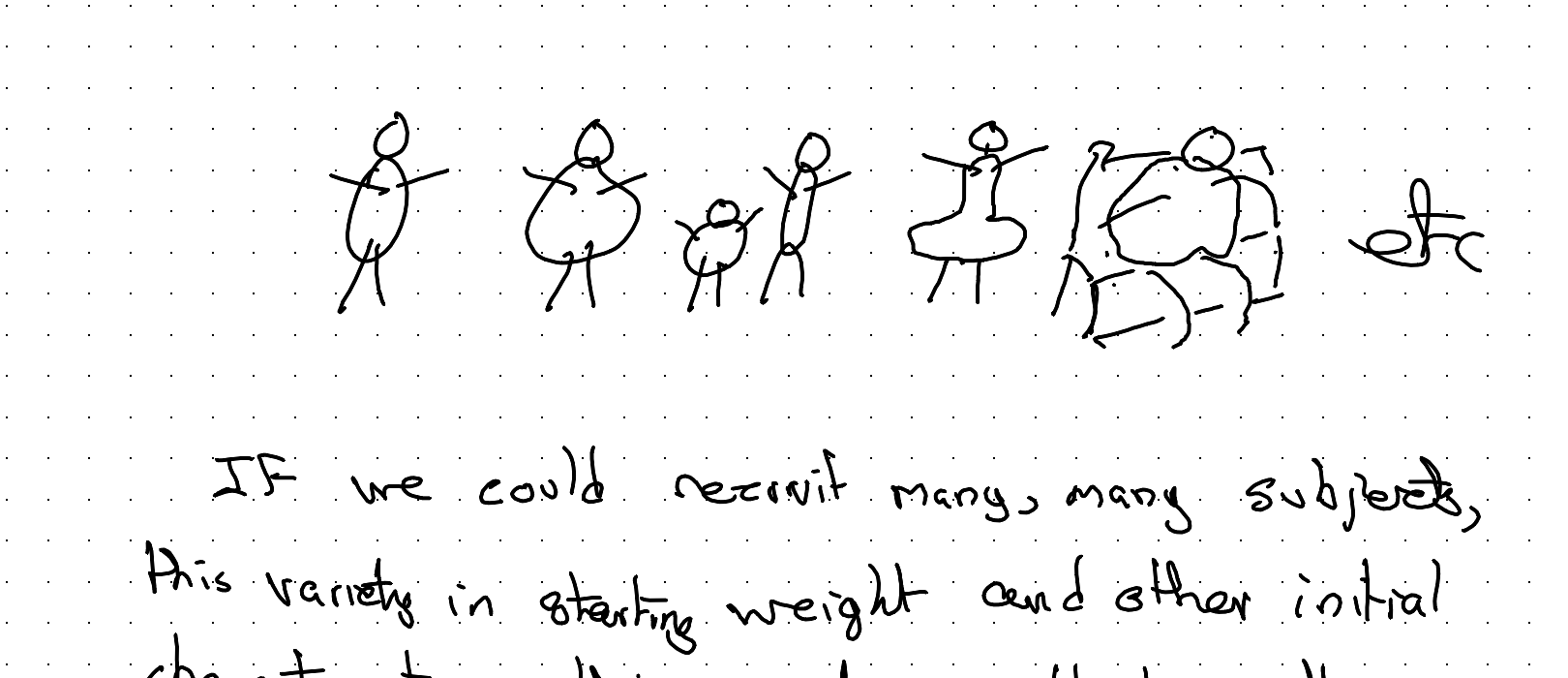 If we could recruit many, many subjects, this variety in starting weight and other initial characteristics, this variety wouldn’t matter too much. We can randomise subjects to Sup A or Sup B, and through the miracles of the randomisation process on average the starting characteristics of subjects in the two arms will be the same.