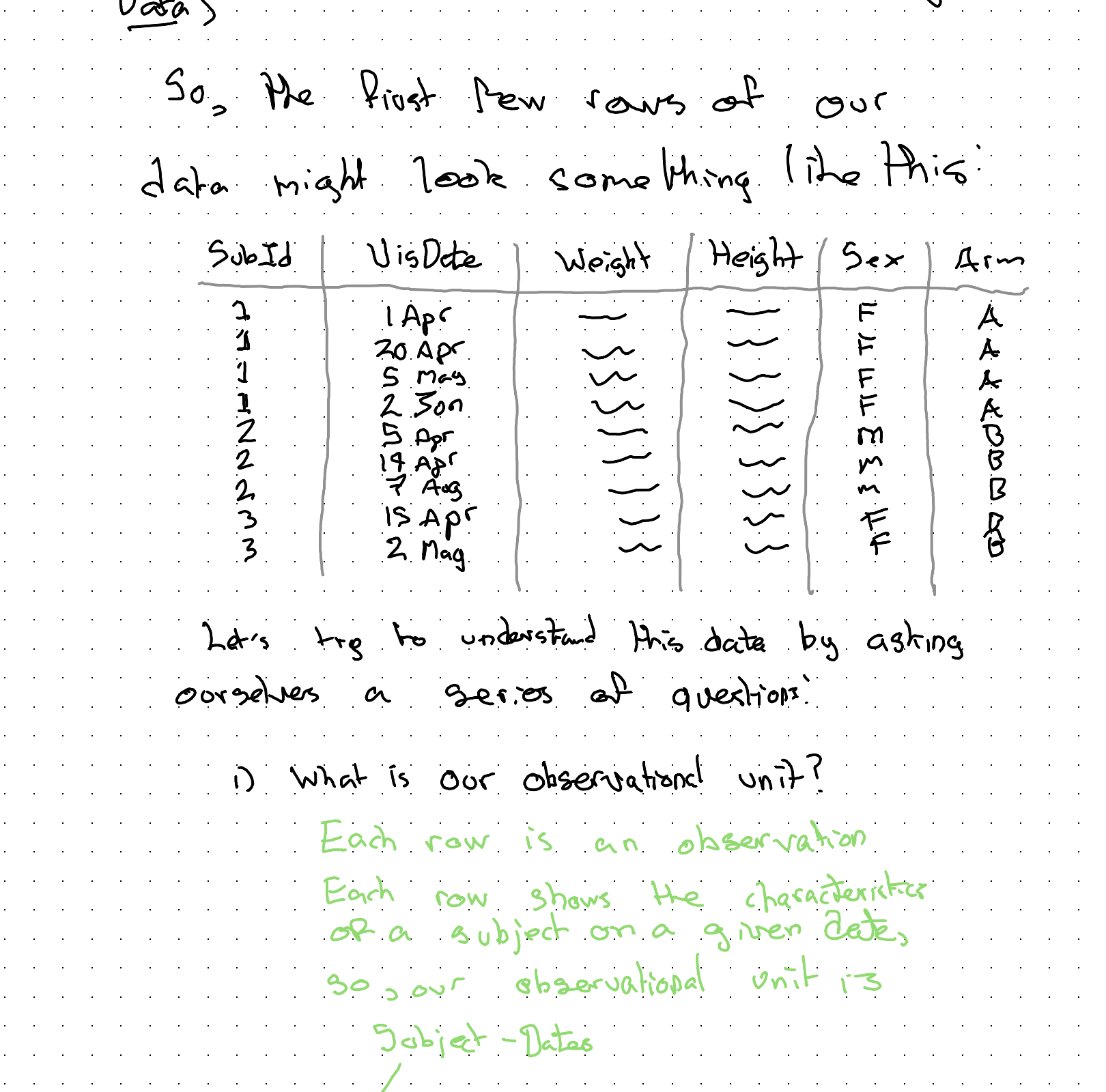 Each row is an observation. Each row shows the characteristics of a given subject at a given point in time. So our observational unit is: Subject-Time.
