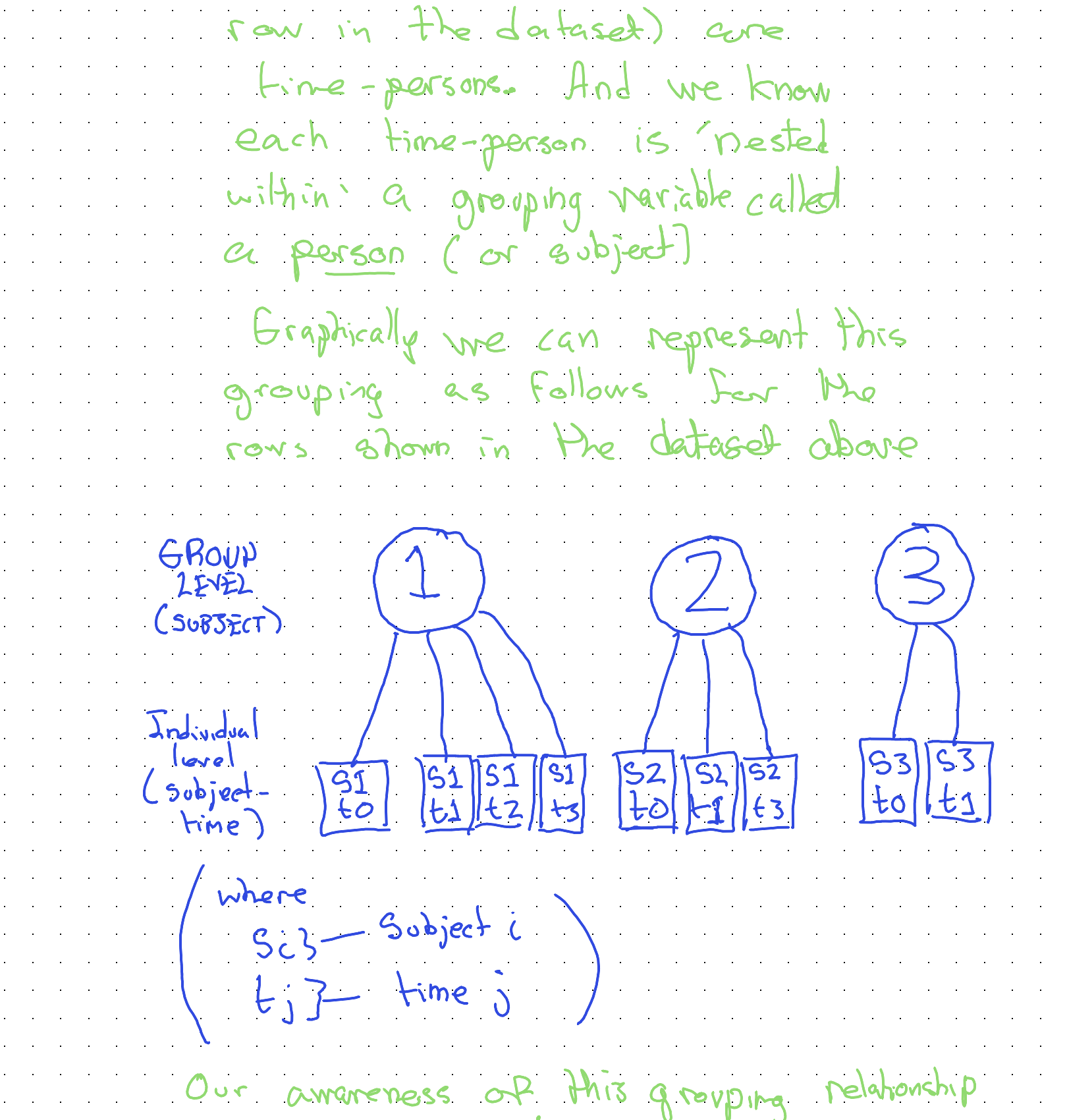 Specifically, our observations (each row in the dataset) are time-persons. And we know each time-person is ‘nested within’ a grouping variable called a person (or subject).