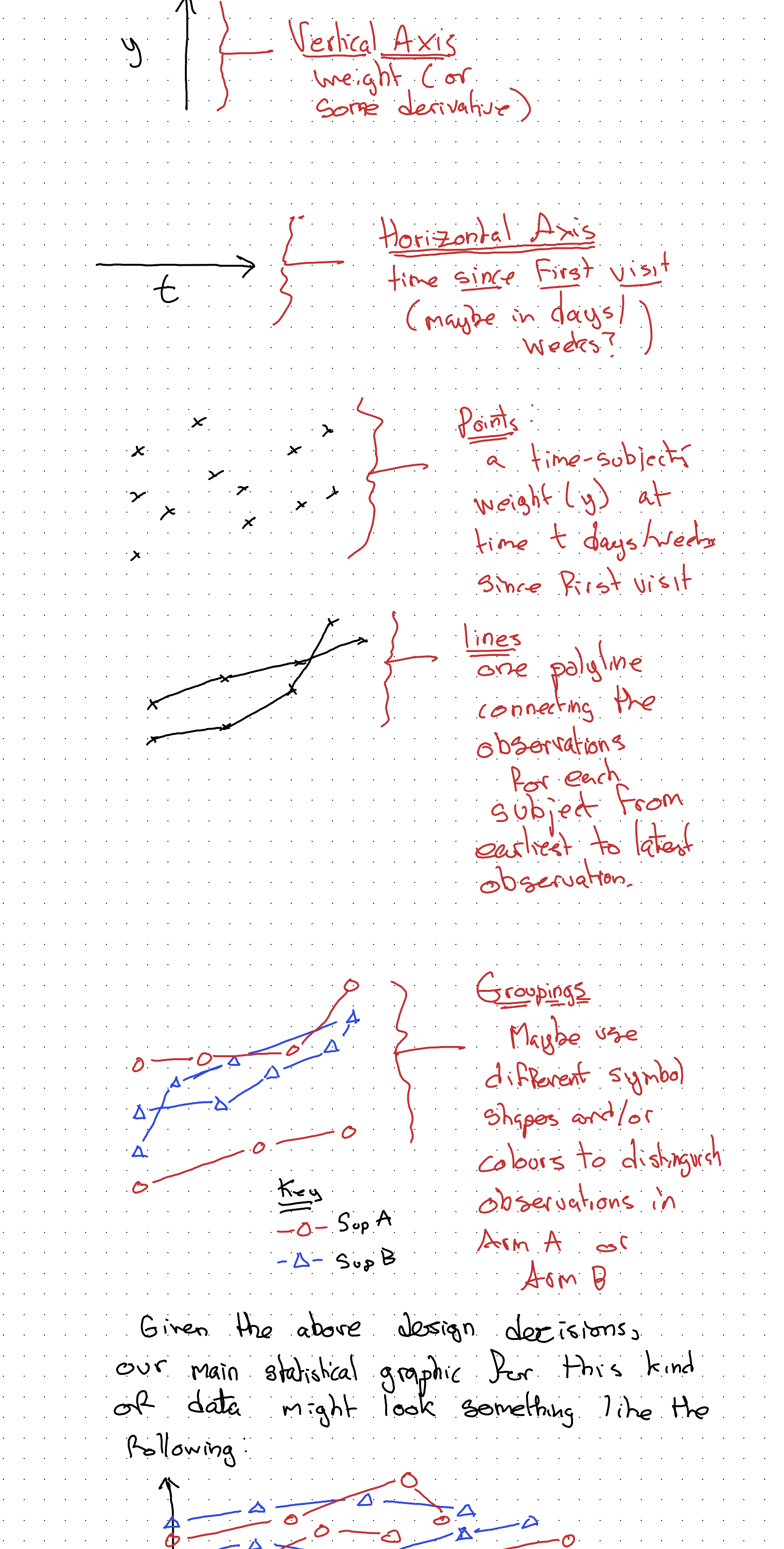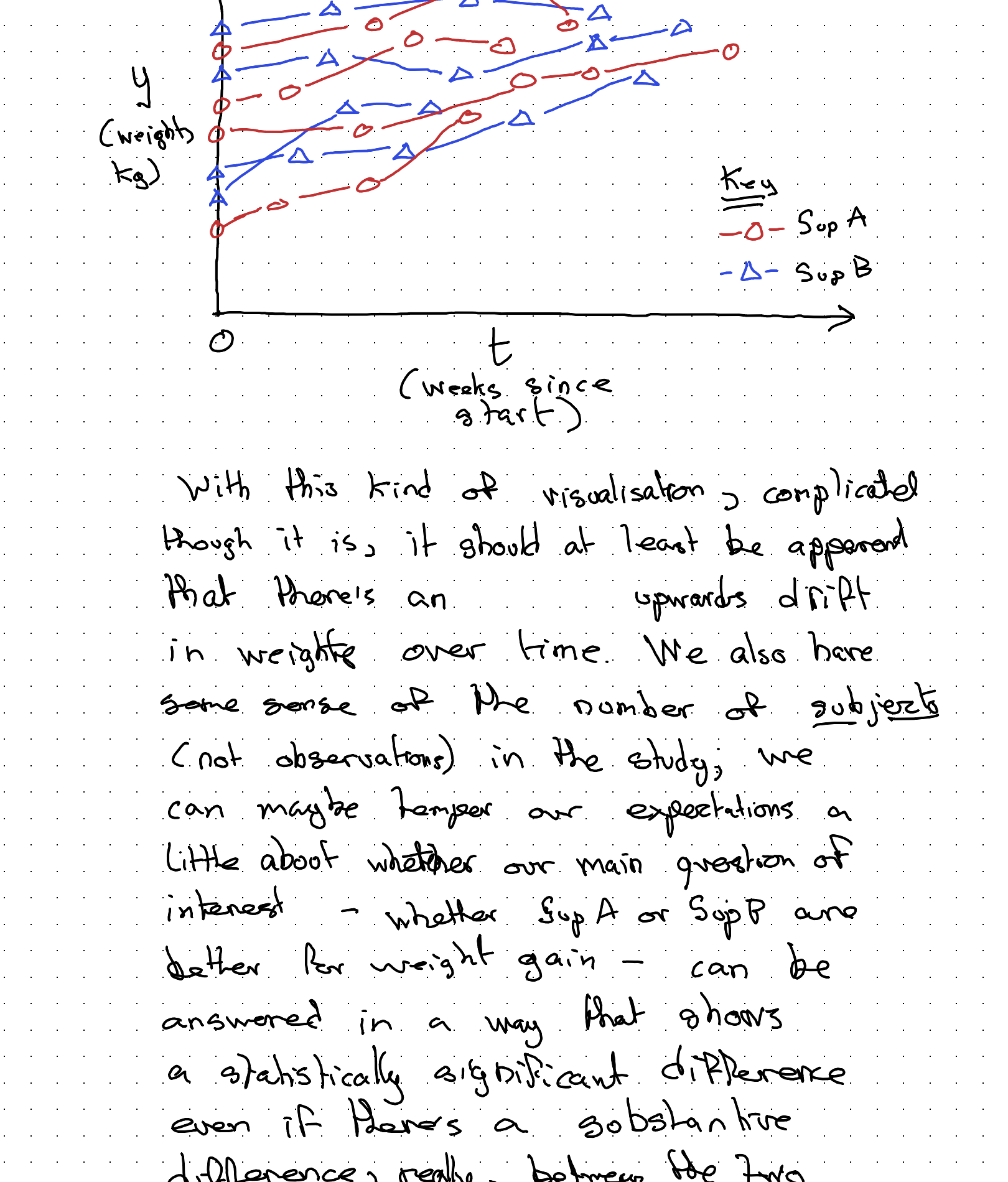 With this kind of visualisation, complicated though it is, it should at least be apparent that there’s an upwards drift in weight over time. We also have some sense of the number of subjects (not observations) in the study; we can maybe temper our expectations a little about whether our main question of interest — whether Sup A or Sup B are better for weight gain — can be answered in a way that shows a statistically significant difference even if there’s a substantive difference really between the two supplements. We might well be underpowered (mainly because I didn’t want to spend too long drawing dots and lines!)