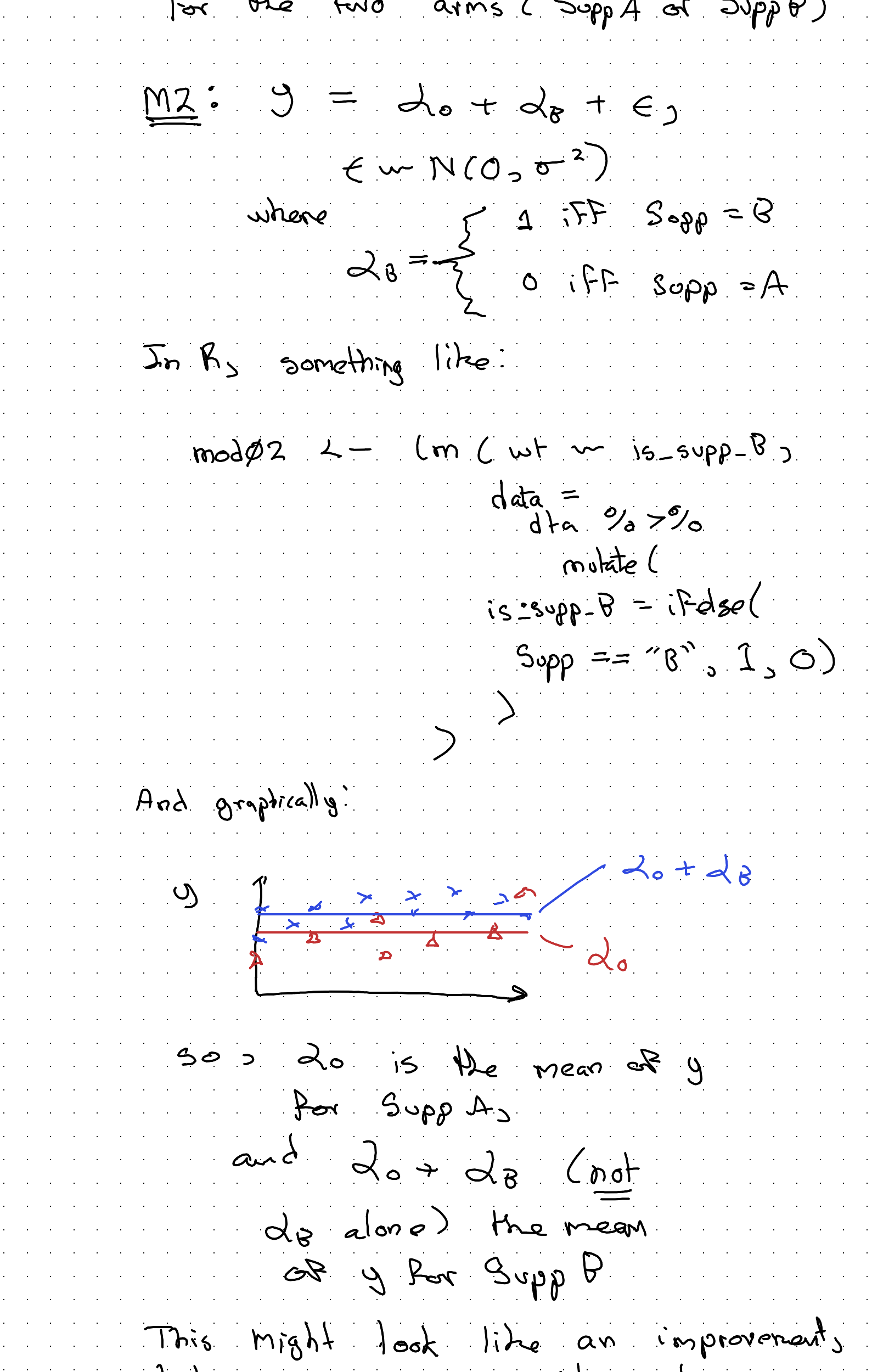 So: \(\alpha_0\) is the mean of y for Supp A, and \(\alpha_0 + \alpha_B\) (not \(\alpha_B\) alone) the mean of y for Supp B.