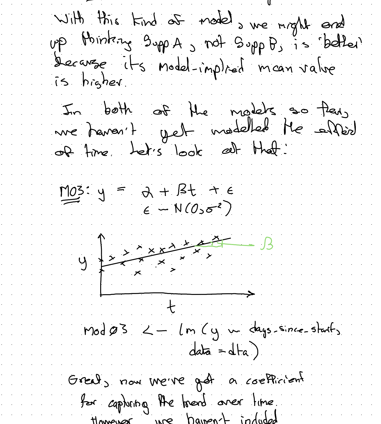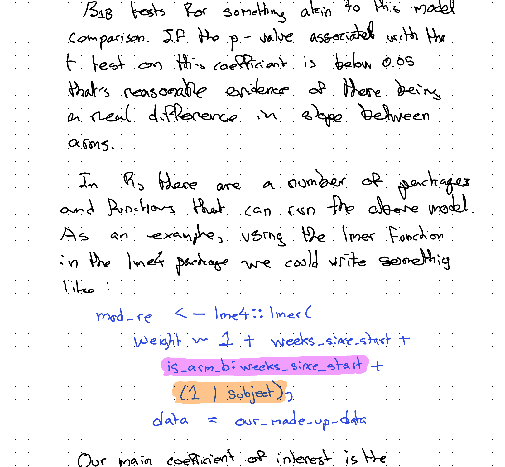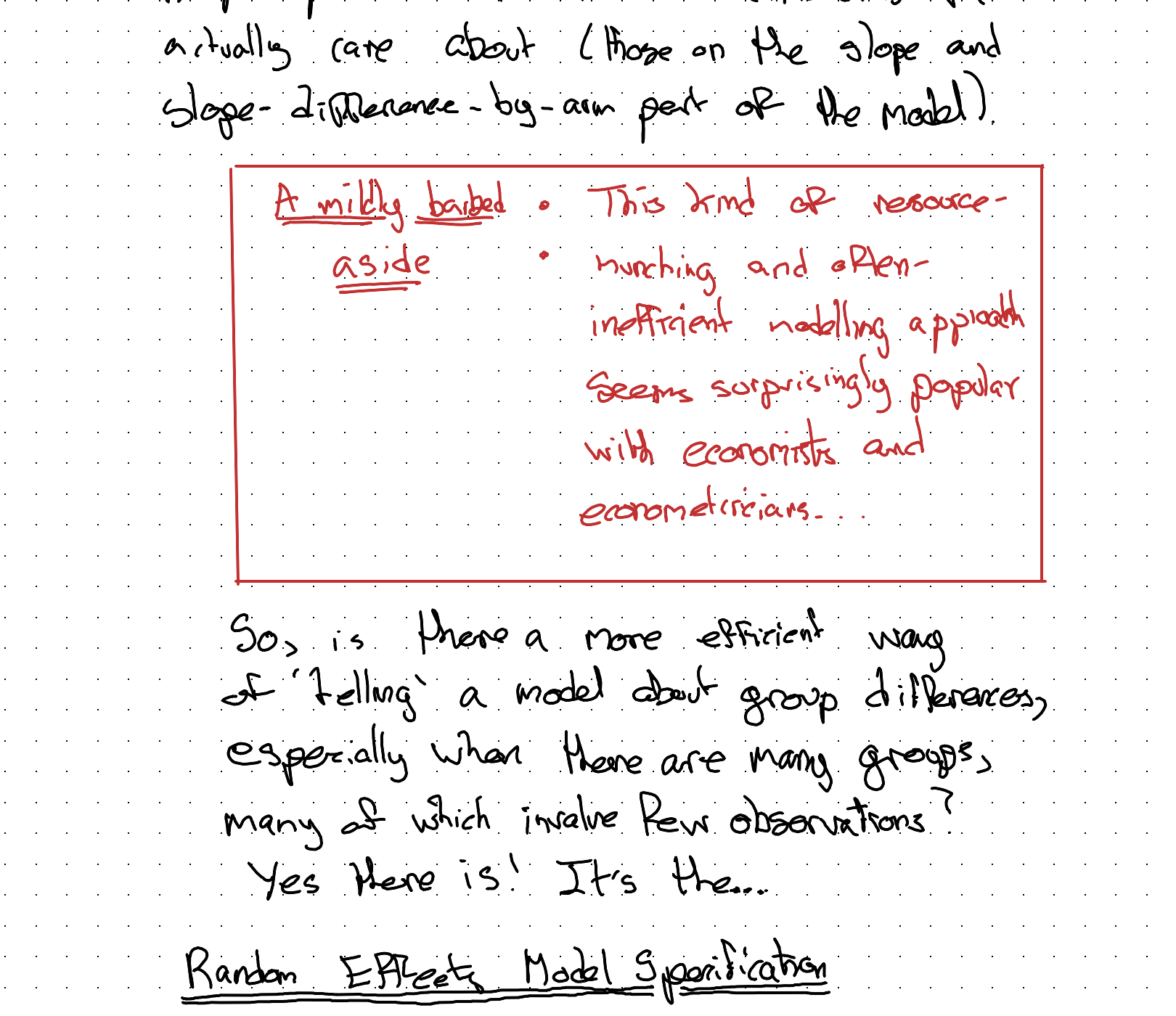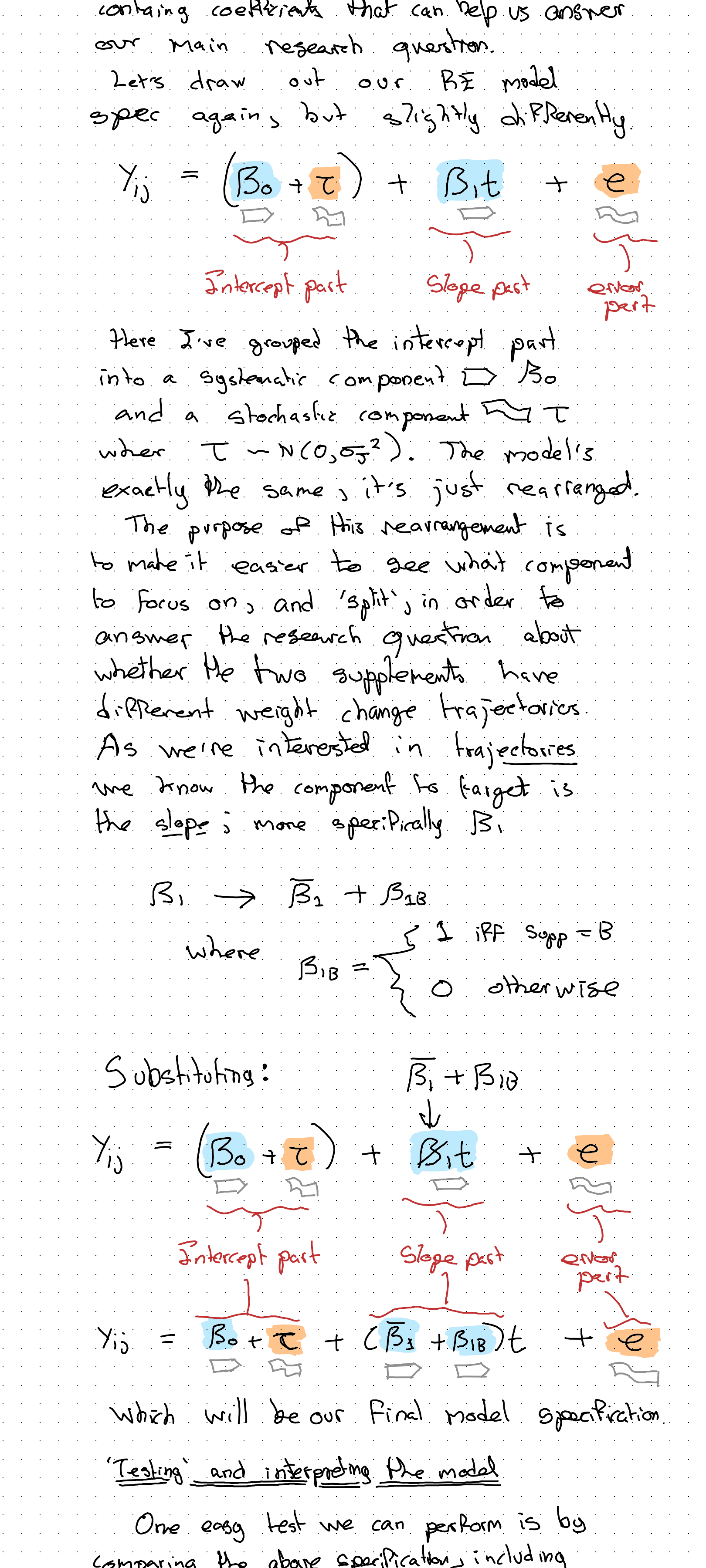 We’re now used to the idea of splitting out the components of a regression model, as they relate to intercepts, slopes, and ‘errors’, and the way we need to do that one more time to get a model containing coefficients that can help us answer our main research question.