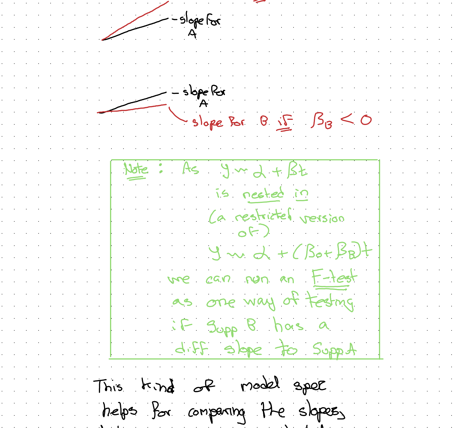 Arguably, the t-value on the coefficient \(\beta_{Bs}\) for testing should also be equivalent (so it might be easier to just look at that instead). But remember: evidence of there being two different slopes between groups is a good reason to understand/explore what these differences in slope between groups really mean.