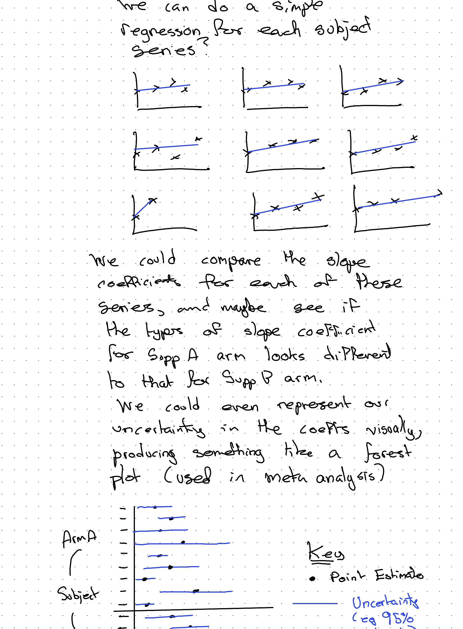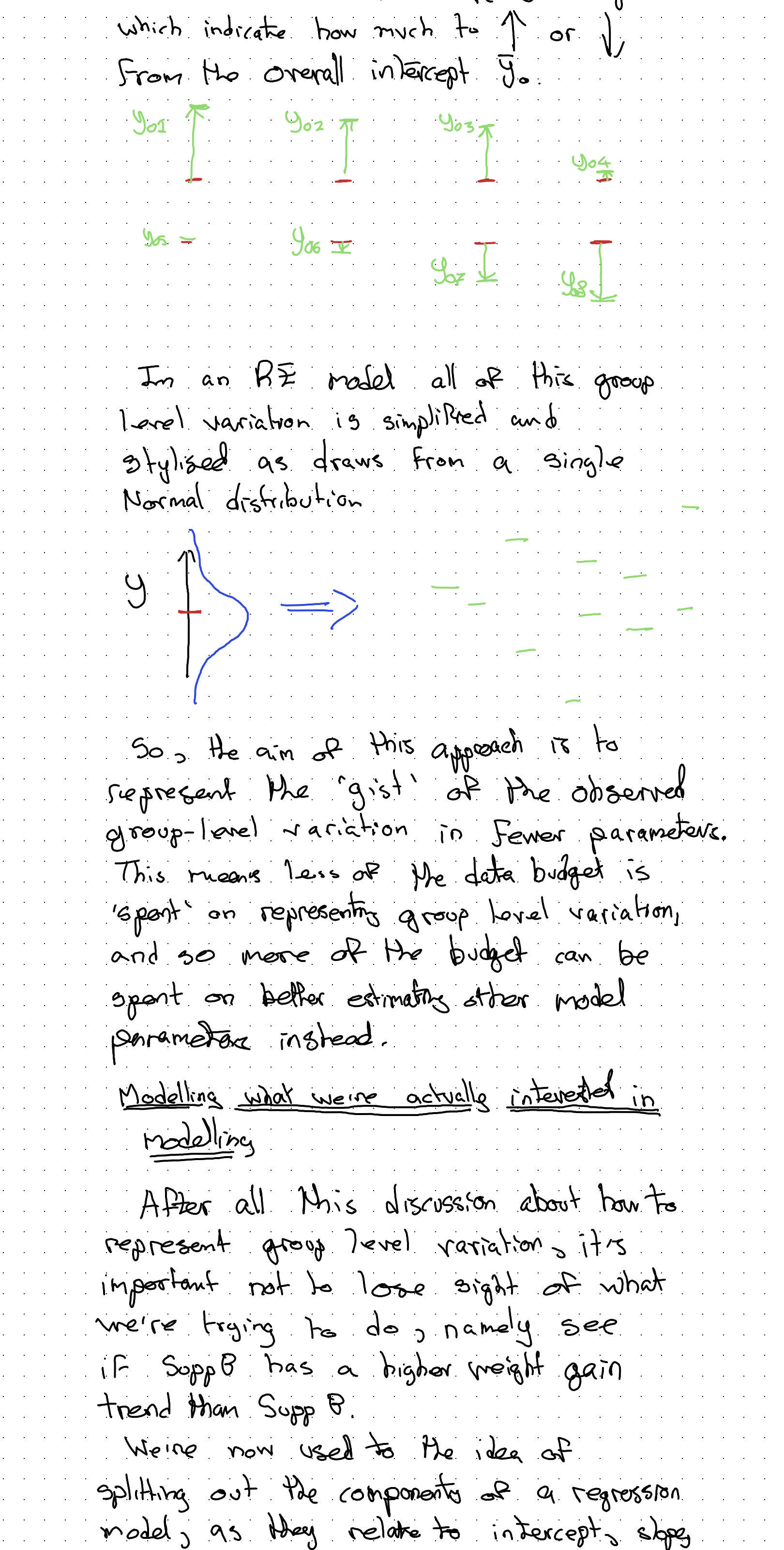 However, with this approach we’re potentially adding a lot of additional coefficients to our model, and if there are a lot of groups, each of which might only contain a handful of observations, this approach might be unnecessarily complicated and ‘gluttonous’, munching its way through our finite data budget in a very inefficient way that leaves little resource left to help improve the fit on the coefficients we actually care about (those on the slope and slope differences, by-arm part of the model).