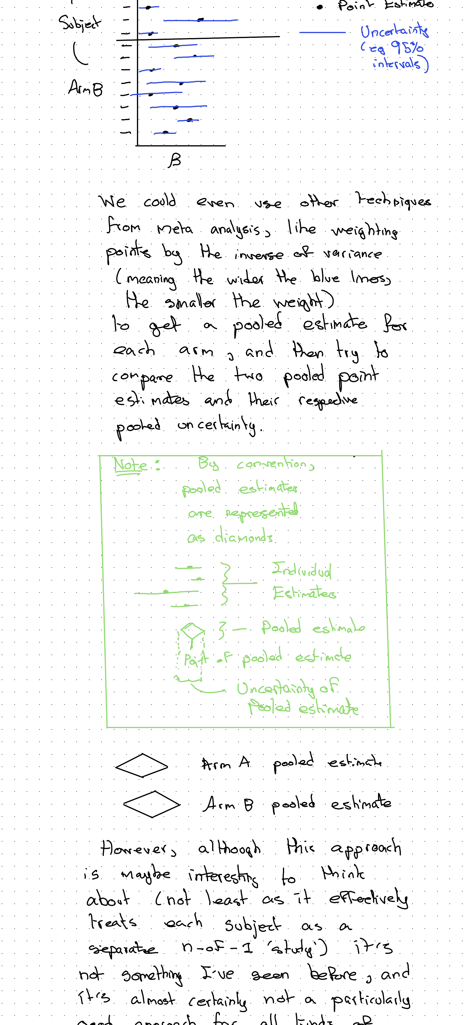 We could even use other techniques from meta analysis, like weighting points by the inverse of variance (meaning the wider the lines, the smaller the weight) to get a pooled estimate for each arm, and then try to compare the two pooled point estimates and their respective pooled uncertainty.