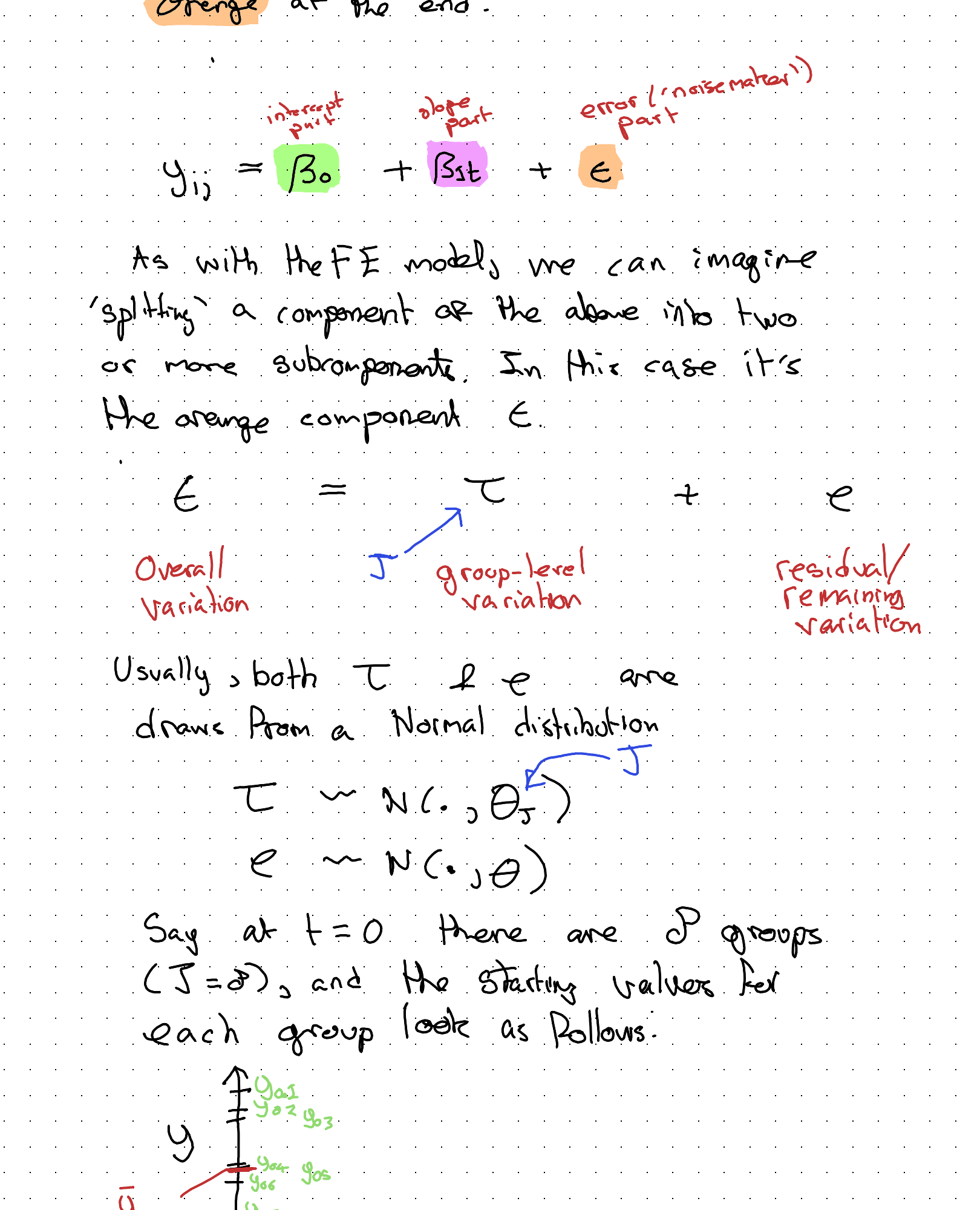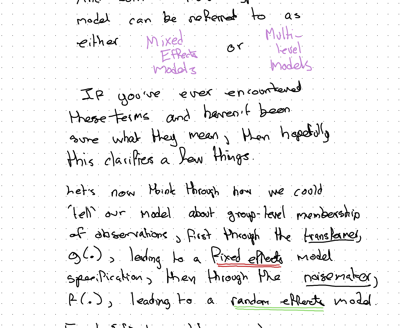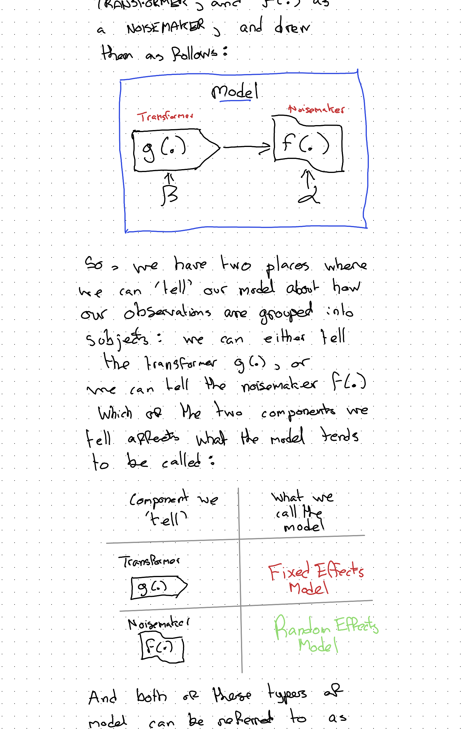 Let’s now think through how we could ‘tell’ our model about group-level membership of observations, first through the transformer, \(g(.)\), leading to a fixed effects model specification, then through the noisemaker, \(f(.)\), leading to a random effects model.