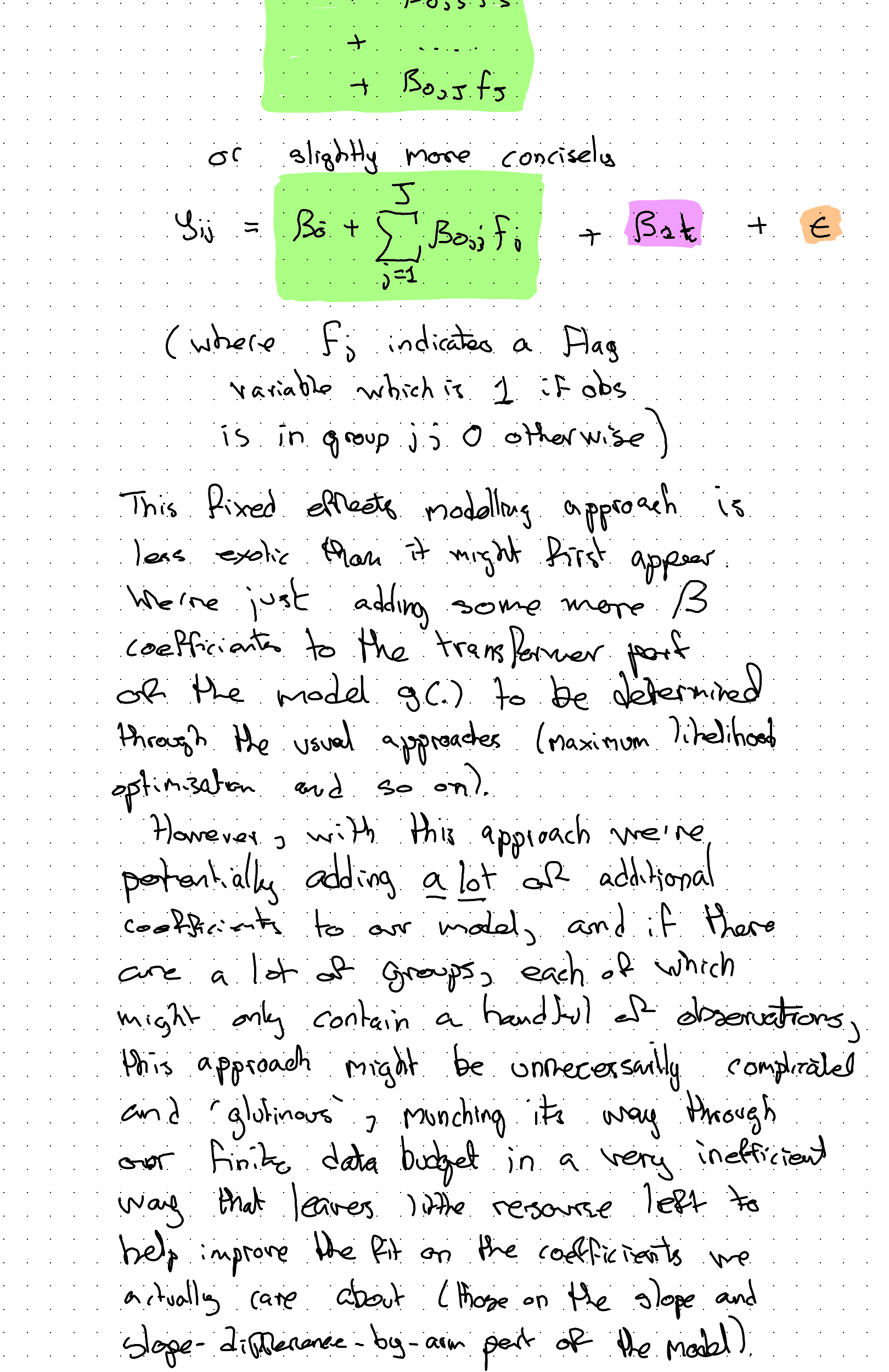 This fixed effects modelling approach is less exotic than it might first appear. We’re just adding some more \(\beta\) coefficients to the transformer part of the model \(g(.)\) to be determined through the usual approaches (maximum likelihood, optimisation and so on).