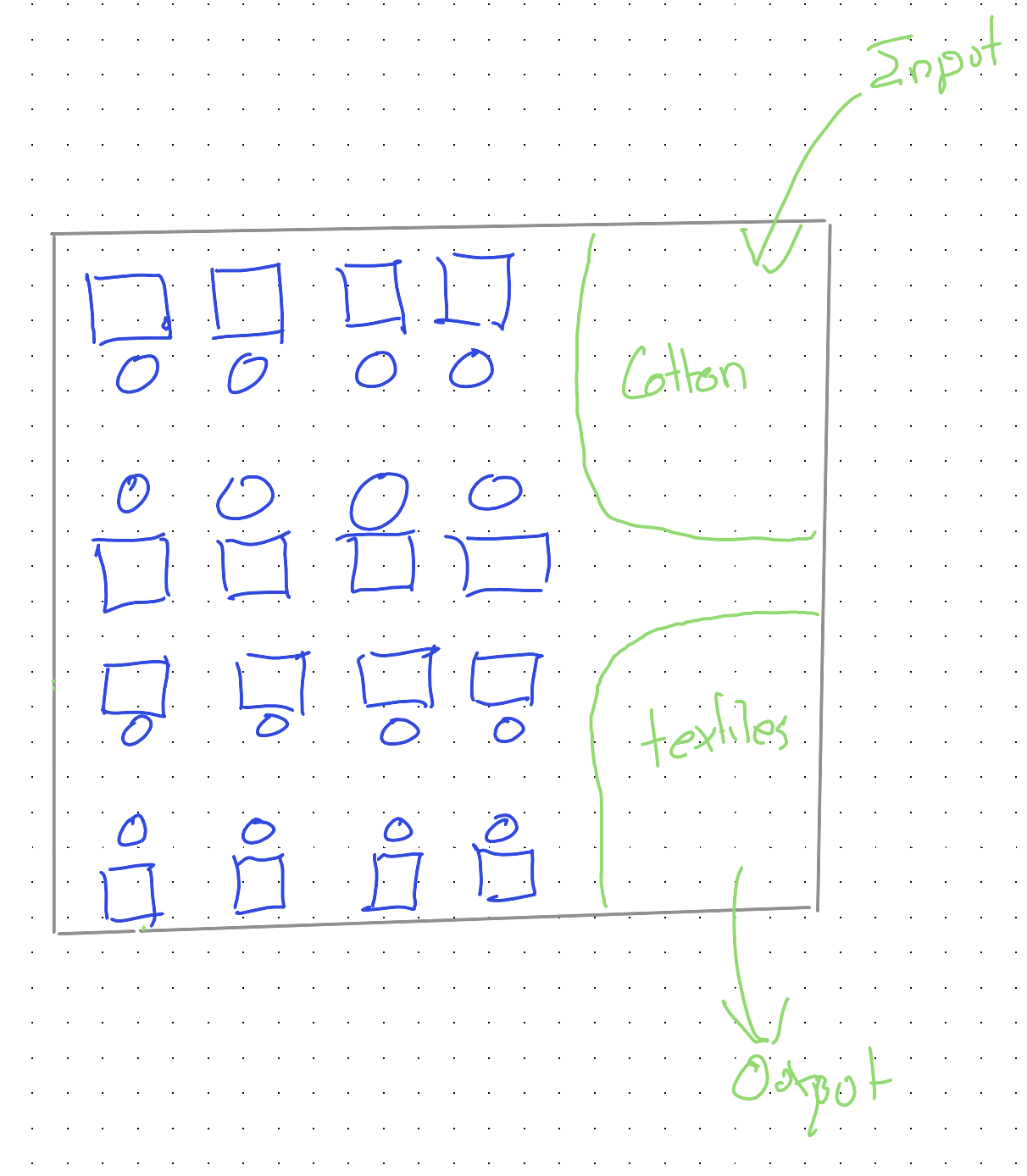 One factory. Sixteen workstations. Sixteen human workers. One input resource: cotton.