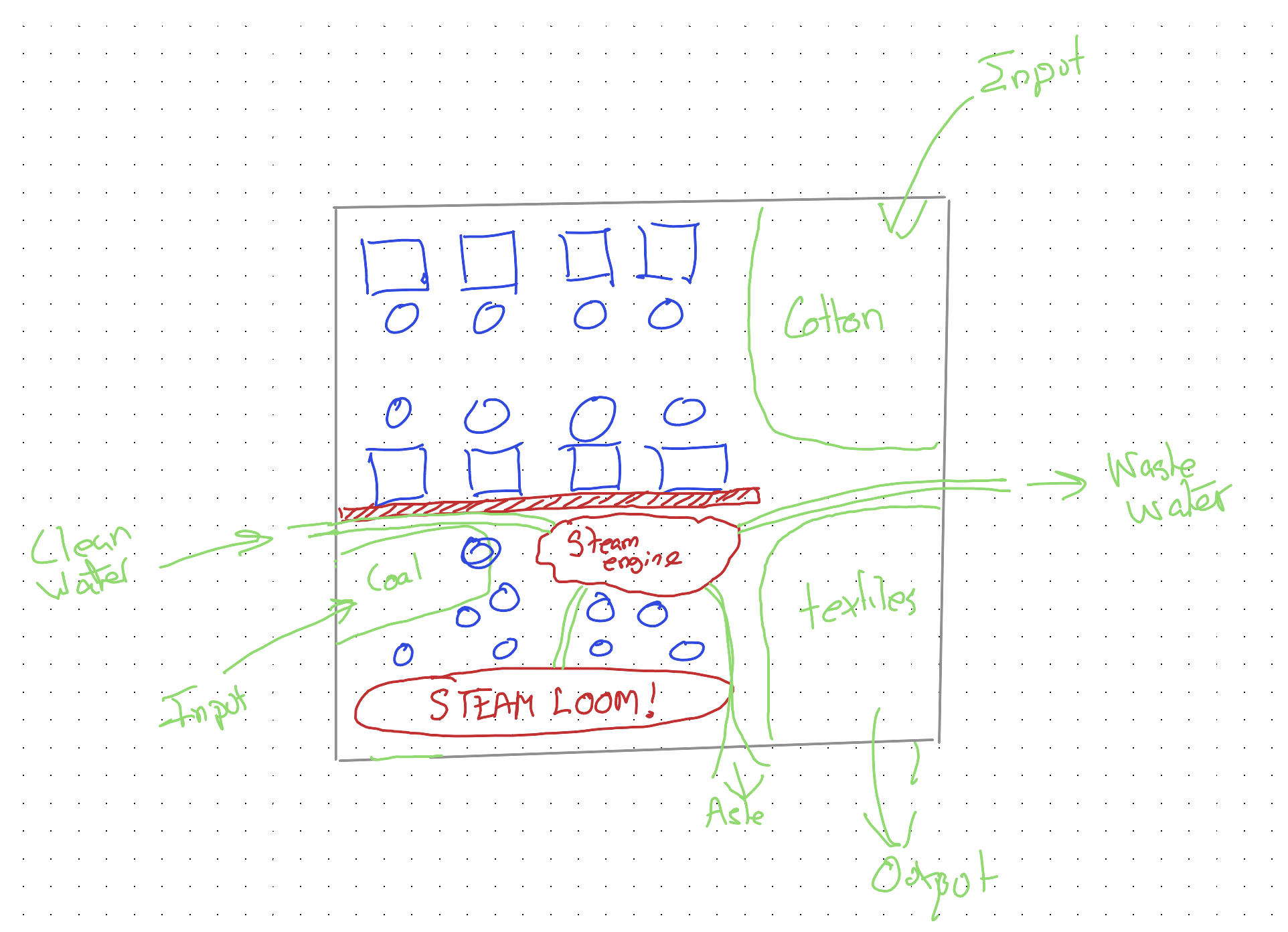 Contamination. It’s quickly identified that coal shouldn’t be kept near cotton or textiles: it makes them dirty, harder to work with, less valuable, harder to sell. Because of this, even more of the factory has to be reconfigured to keep the coal separate from the raw and finished product.