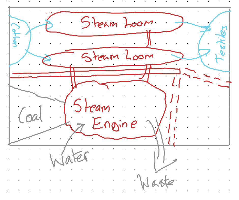 Either the factory owner would have stopped the experiment before more than half the factory got turned over to meeting the needs of the steam loom, or they’d have reached this point — and realised that, after all this cost and effort and expense, the net result of all this disruption is lower output at greater cost.