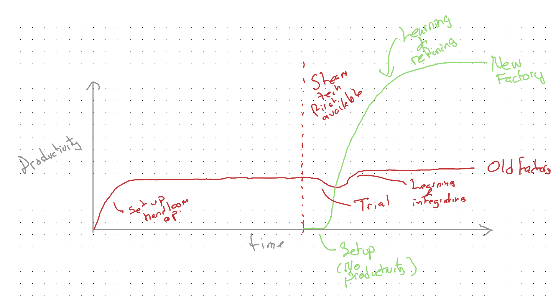 Both incumbent and newcomer adopted the same new technology. But for the incumbent, this led initially to declines in productivity, and then — if they persisted — only to marginal gains. The newcomer also adopted the new technology, but built their entire workflow, logistics, and infrastructure around it. As a result, they were eventually able to achieve far greater productivity than the old factory ever could.