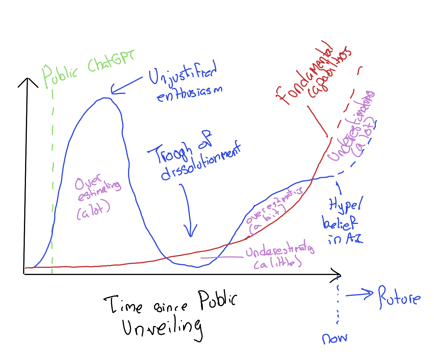 So, we in effect have two hypothetical curves: one for public enthusiasm for AI; another for underlying capabilities of public facing AIs. When enthusiasm outpaces capabilities, we have periods of overestimating AI; and when capabilities outpace enthusiasm, we have periods of underestimating AIs.